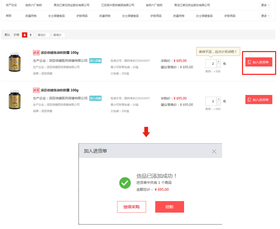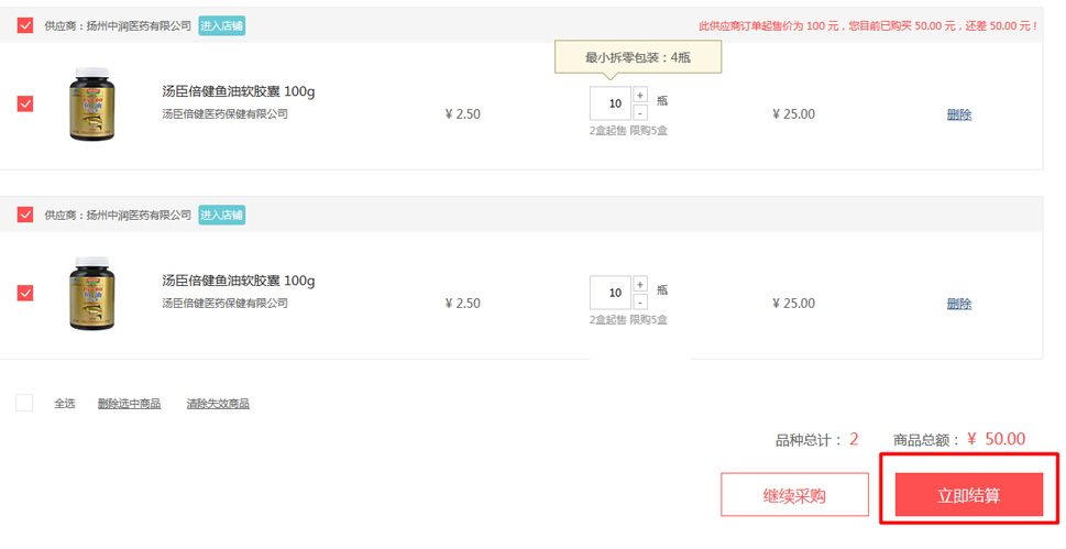 2在進貨單頁面可以看到所有加入進貨單的藥品,選擇需要購買的藥品,點擊"立即結算"進入訂單確認頁
