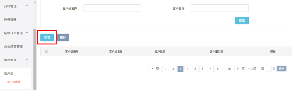 1進入“客戶組-客戶組管理”頁面進行客戶組新增。點擊“新增”按鈕